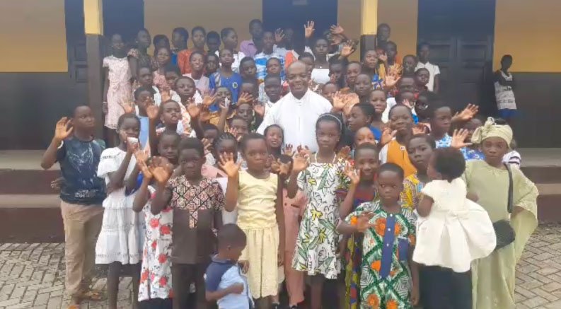 See photo of kids with Fr Paul and presentsEmpowering the Youth in Ghana: Our Mission with Father Paul